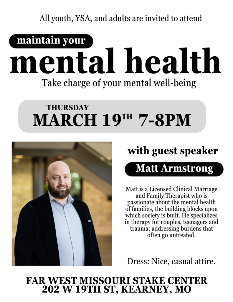 Youth, YSA and adults are invited to attend a fireside on Thursday March 19th from 7-8pm in the Kearney building. The evening will feature guest speaker Matt Armstrong, a Licensed Clinical Marriage and Family Therapist, as he speaks on taking charge of our mental health.